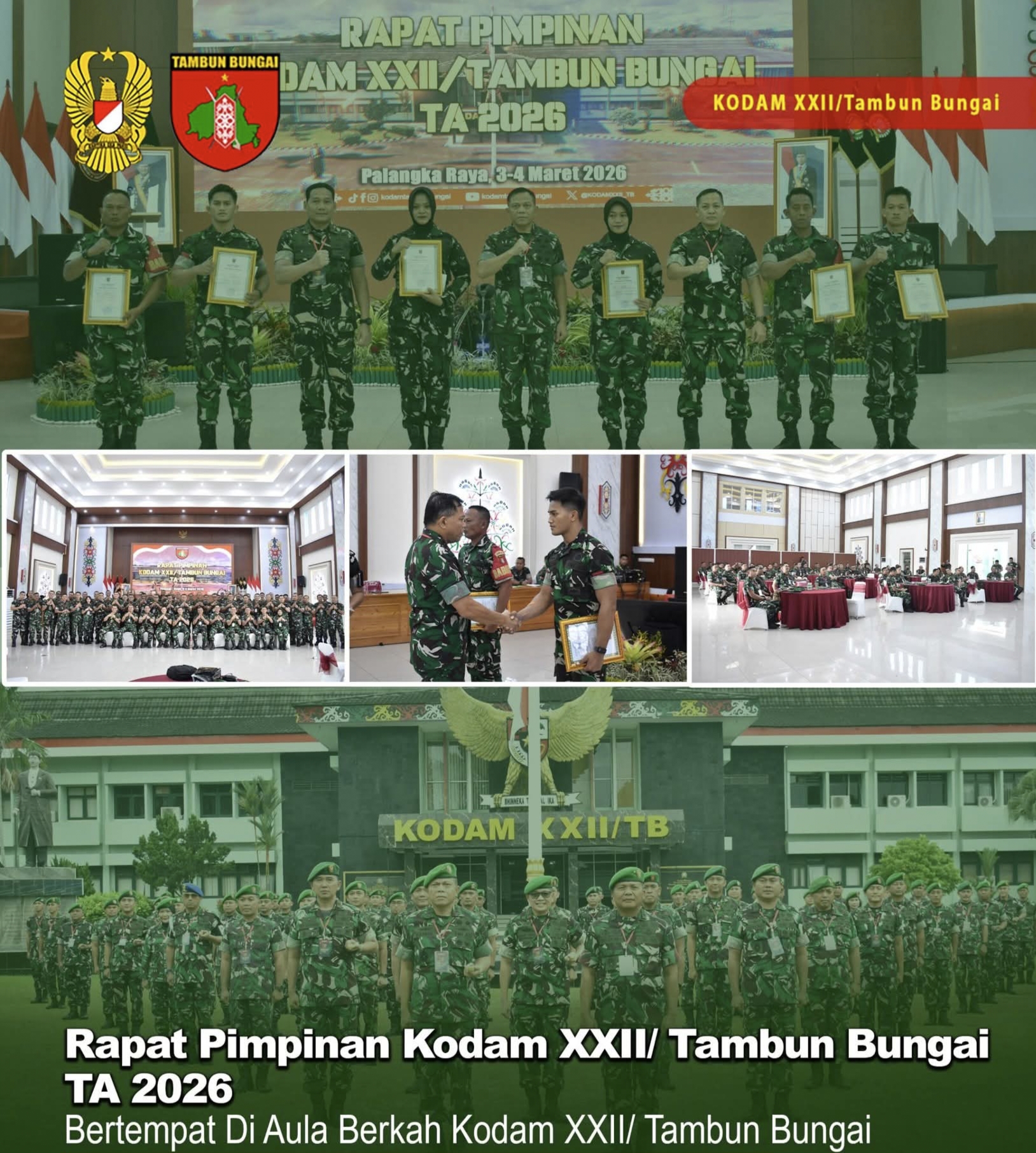 Palangka Raya – Pangdam XXII/Tambun Bungai, Mayjen TNI Zainul Arifin, S.A.P., M.Sc., memimpin Rapat Pimpinan (Rapim) Tahun Anggaran 2026 di Balai Berkah Makodam XXII/TB, Jl. Imam Bonjol, Kota Palangka Raya, Rabu (4/3/2026). Kegiatan diikuti Kasdam, Irdam, Kapoksahli, para Danrem, Danrindam, Asisten Kasdam, Dan/Kabalakdam, Dandim hingga Danyonif jajaran.